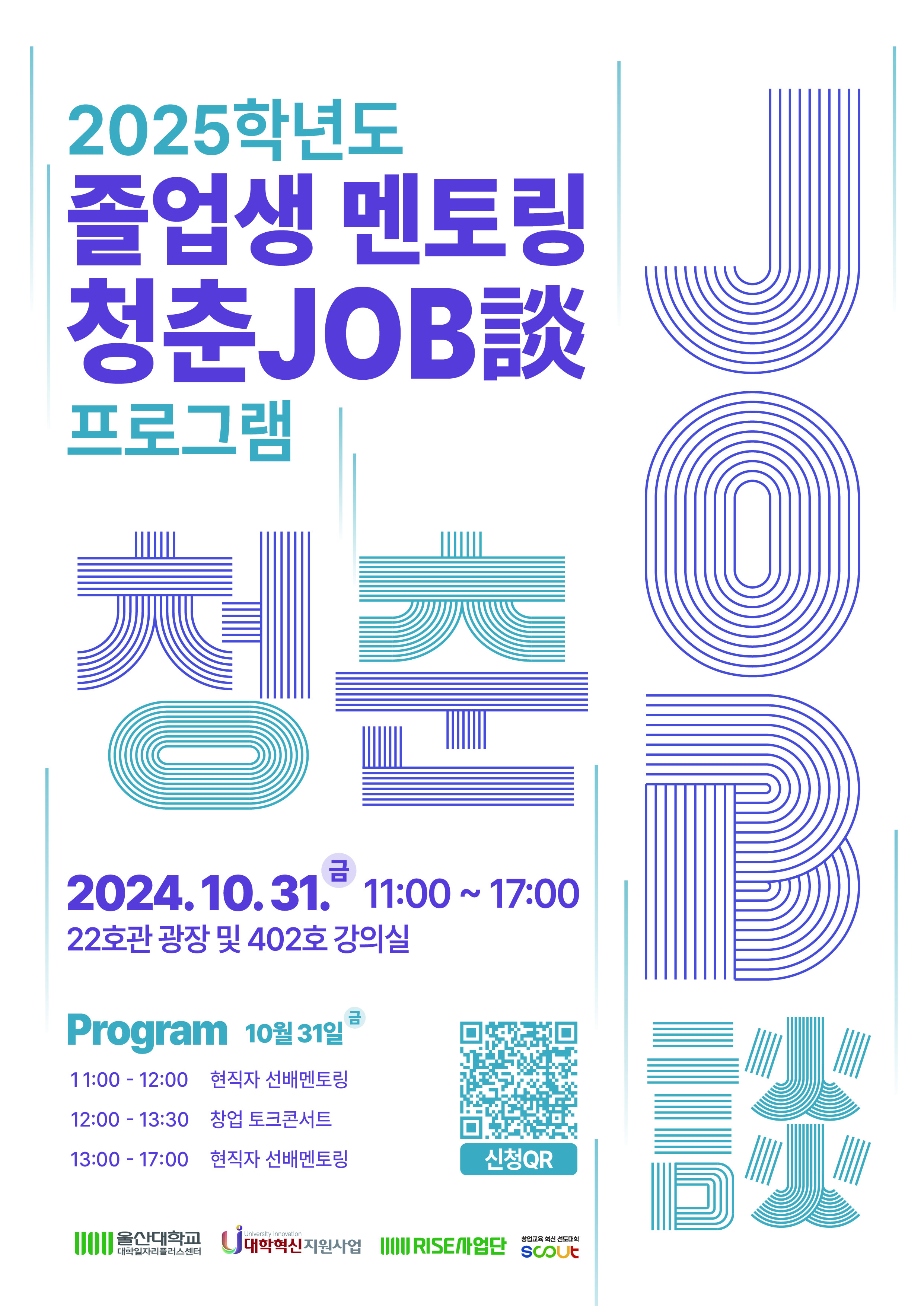 2025학년도 졸업생 멘토링 '청춘job談(청춘잡담)' 프로그램 나. 일시: 2025. 10. 31.(금), 10:00 ~ 17:00 다. 장소: 학생회관 광장 및 402호 강의실 라. 내용 1) 청춘잡담 선배 멘토링(10:00~17:00 / 학생회관(22호관) 광장) - 유스타 신청 시 선착순 취업수기 책자 증정 - 현직자 멘토링 명단은 유스타 참고 2) 청춘잡담 창업 토크 콘서트(12:00~13:30 / 22호관 402호 강의실) 3) 신청링크: https://ustar.ulsan.ac.kr/ko/program/ALL/view/2895/description