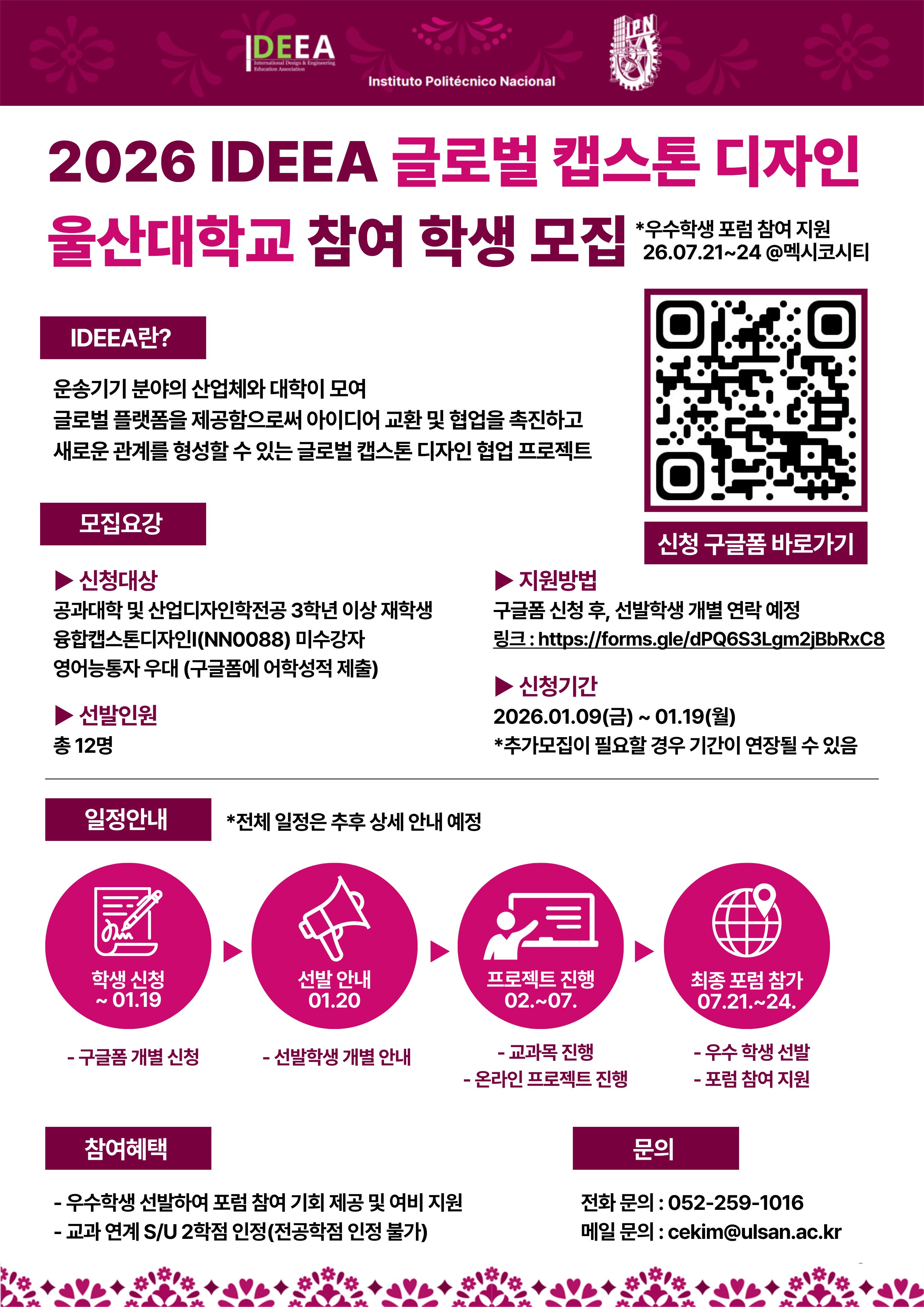 ■ 접수기간: ~2026.01.19.(월) ■ 접수대상 - 공과대학 및 산업디자인학전공 3학년 이상 재학생 - 융합캠스톤디자인Ⅰ(NN0088) 미수강자 - 영어능통자 우대(구글폼에 ★어학성적★ 제출) ■ 선발인원: 12명 ■ 모집공고: 울산대학교 | 공학교육혁신센터 ※ 자세한 사항은 모집 공고 확인 |